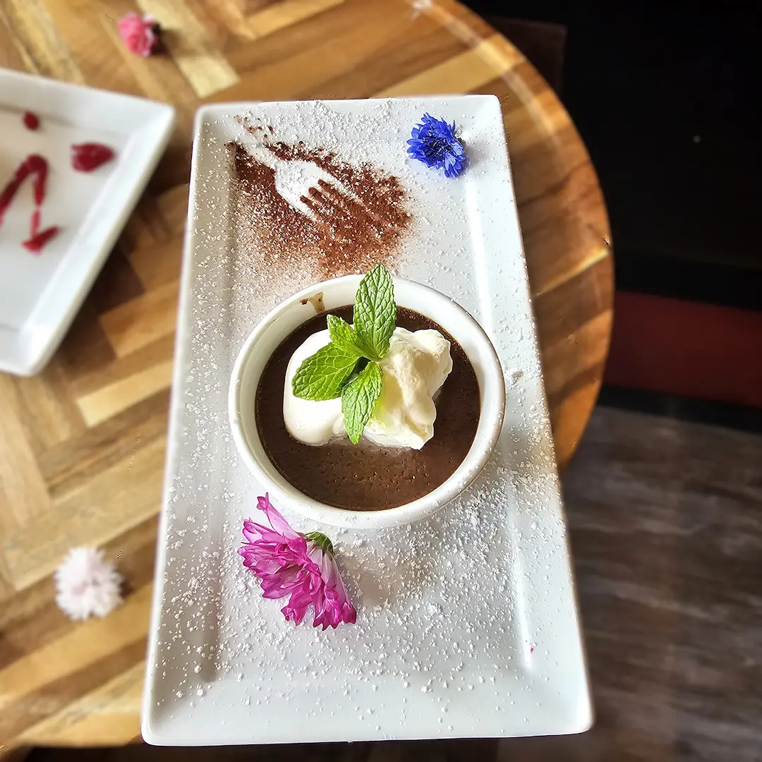 A decadent French custard infused with premium dark chocolate and espresso, served chilled with fresh cream and a mint sprig.