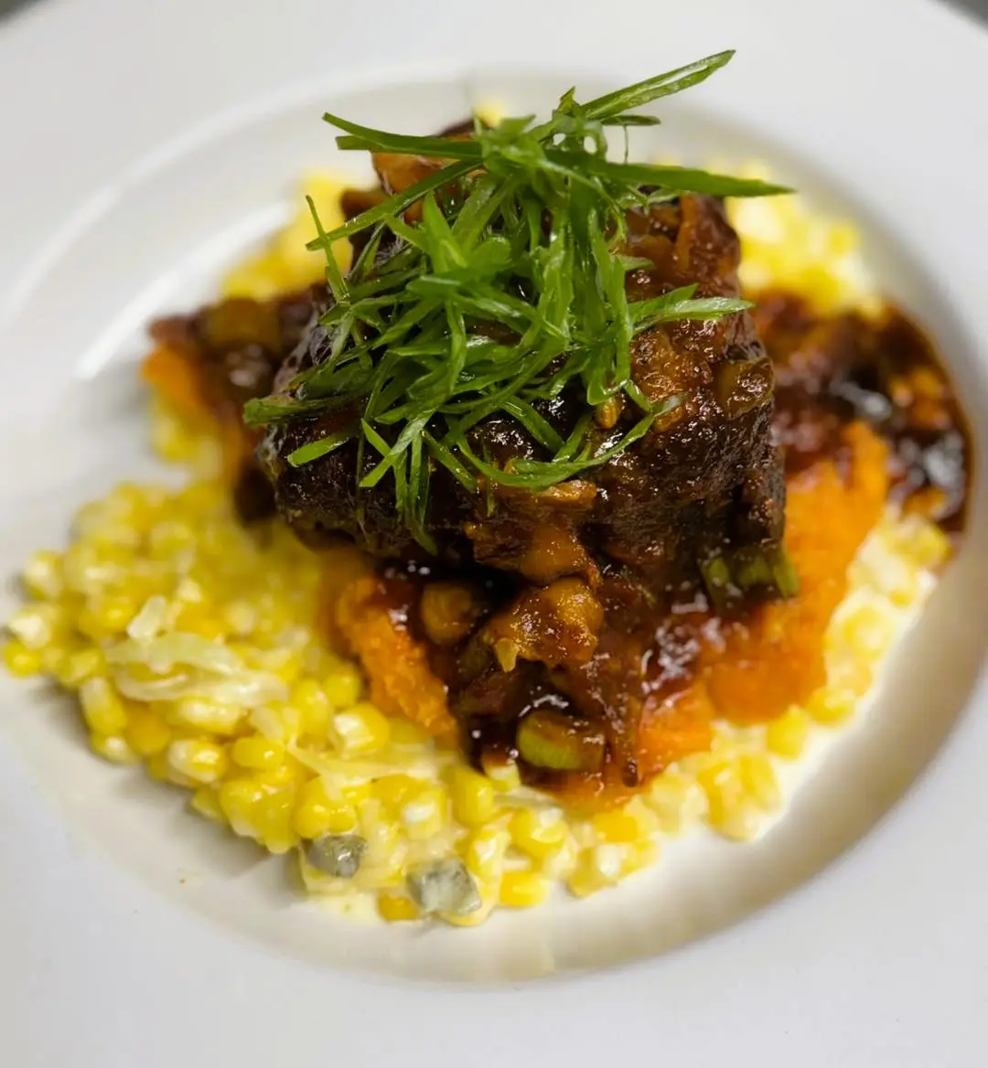 Slow‑braised pork shoulder in Southern Comfort BBQ sauce over brown sugar yam mash with jalapeño creamed corn, green onion, and maple‑bacon salsa.